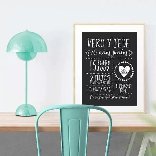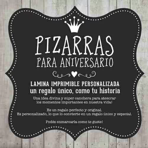 LAMINA IMPRIMIBLE TIPO PIZARRA PERSONALIZADA "ANIVERSARIO" Con los diseños exclusivos de Decora tu Cumple! Una idea divina y súper canchera para atesorar momentos importantes en nuestra vida! Es un regalo perfecto y original. Es personalizado, lo que lo convierte en un regalo único y especial. Podés enmarcarla como te guste! También con nuestras láminas podés decorar el salón y armar un lindo fondo para sacar fotos en el festejo. Te enviamos la lámina en FORMATO DIGITAL por mail, totalmente personalizada en tamaño 20 x 25 cm. o 40 x 50 cm. y con los datos del aniversario. Te la enviamos lista para imprimir en casa o en la tienda gráfica o de fotos más cercana. Qué te enviamos? Te enviamos por mail tu lámina de aniversario personalizada en el formato elegido. Pedilo en la medida que prefieras: 13 x 18 cm, 20 x 25 cm ó 40 x 50 cm Consultá por otras medidas y otros motivos! Cómo lo pedís: Una vez que hiciste tu compra, vas a recibir un mail solicitando la siguiente info: 1. Nombre de la pareja 2. Cuantos años de casados 3. Fecha de casamiento 4. Cantidad de hijos, nombres 5. Según el modelo… cantidad de mudanzas, perro, etc. En cuánto tiempo está listo? Una vez que recibimos esta info (toda junta!), tu linda lámina estará lista en una semana. Empezá a construir tus recuerdos con nuestras láminas personalizadas!