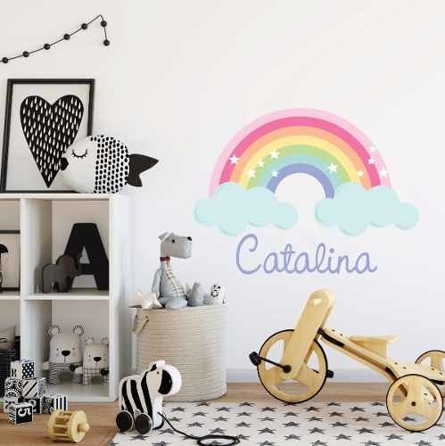 El Kit de vinilo ARCO IRIS PASTEL viene troquelado, listo para pegar donde quieras (paredes, muebles, electrodomésticos) PEDILO CON EL NOMBRE QUE QUIERAS! (Medida máxima 60 x 25 cm. ancho x alto) Medida del Arcoiris: 96 x 55 cm. (ancho x alto) Incluye el Arco iris más el nombre que elijas. Decinos de que color querés las nubes segun el color de tu pared. El color del nombre lo podes pedir segun el color de la pared. Vos recibís una única plancha, con la que transferís facilmente los elementos donde querés. Vinilizá tu cuarto, tu casa, tu vida! PREGUNTAS FRECUENTES: * Tenes stock? si, siempre hay, porque los producimos a pedido, tardamos máximo 5 días hábiles! * Se puede cambiar un color? si, pero puede demorar un poco más... * Lo puedo aplicar en cualquier lado? si, si la superficie es bien lisa, pueden ser paredes si estan pintadas con pintura plástica, nunca rugosas, puertas, muebles laqueados, electrodomésticos, vidrios... * Es fácil de pegar? si, muy fácil! es como un sticker. * Enviás al interior? si, a todo el pais, con mercadoenvíos, funciona perfecto, y podés calcular el tiempo y costo en la base de la publicación. * Conviene mercadoenvíos para entregas en Capital? si, porque los costos son muy bajos, te va a costar menos que un taxi, remise o moto! * Lo puedo retirar en persona? si, de lunes a viernes de 9 a 13 y de 14 a 19 hs en Villa Crespo.
