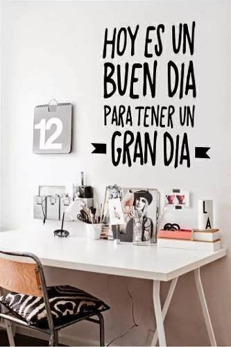 Frase "Hoy es un buen día para tener un gran día" Decorá con frases, es la última moda! ponele un toque positivo a tu ambiente! Es muy fácil de colocar! podés pegarlas en paredes, vidrios, muebles o donde quieras! Medida: 60 x 58 cm. (alto x ancho) PREGUNTAS FRECUENTES: * Lo puedo aplicar en cualquier lado? si, si la superficie es bien lisa, pueden ser paredes si estan pintadas con pintura plástica, nunca rugosas, puertas, muebles laqueados, electrodomésticos, vidrios... * Es fácil de pegar? si, muy fácil! es como un sticker.* Lo puedo retirar en persona? Si, de lunes a viernes de de 9 a 13 y de 14 a 19 hs. en Villa Crespo