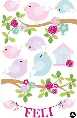 Incluye dos ramas con pajaritos + la casita + 4 pajaritos sueltos y el nombre sostenido por un hilo y dos pajaritos.