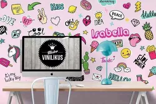 El Vinilo stickers teens incluye una plancha de 50 x 70 cm con 50 stickers troquelados ideales para decorar el cuarto de los adolescentes.. frases, dibujitos, todo lo que ves publicado en la tercer imagen.